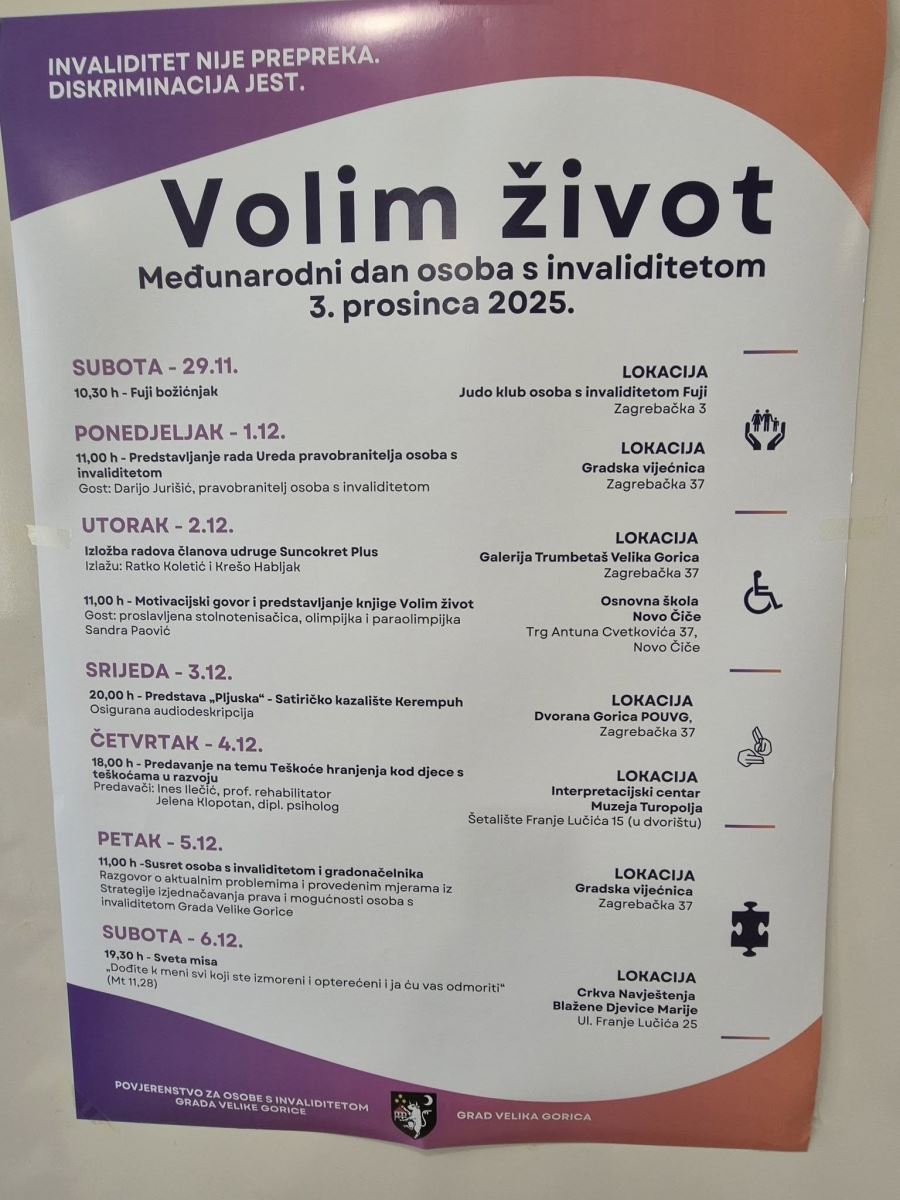 Tradicionalni susret osoba s invaliditetom i predstavnika Grada Velike Gorice održan je 8. prosinca u Gradskoj vijećnici Pučkog otvorenog učilišta, povodom obilježavanja Međunarodnog dana osoba s invaliditetom. U ime gradonačelnika Krešimira Ačkara događaju je prisustvovala pročelnica za predškolski odgoj, školstvo i društvene djelatnosti Lana Krunić Lukinić, koja je u svom obraćanju istaknula predanost Grada stvaranju inkluzivne zajednice i unapređenju kvalitete života osoba s invaliditetom.