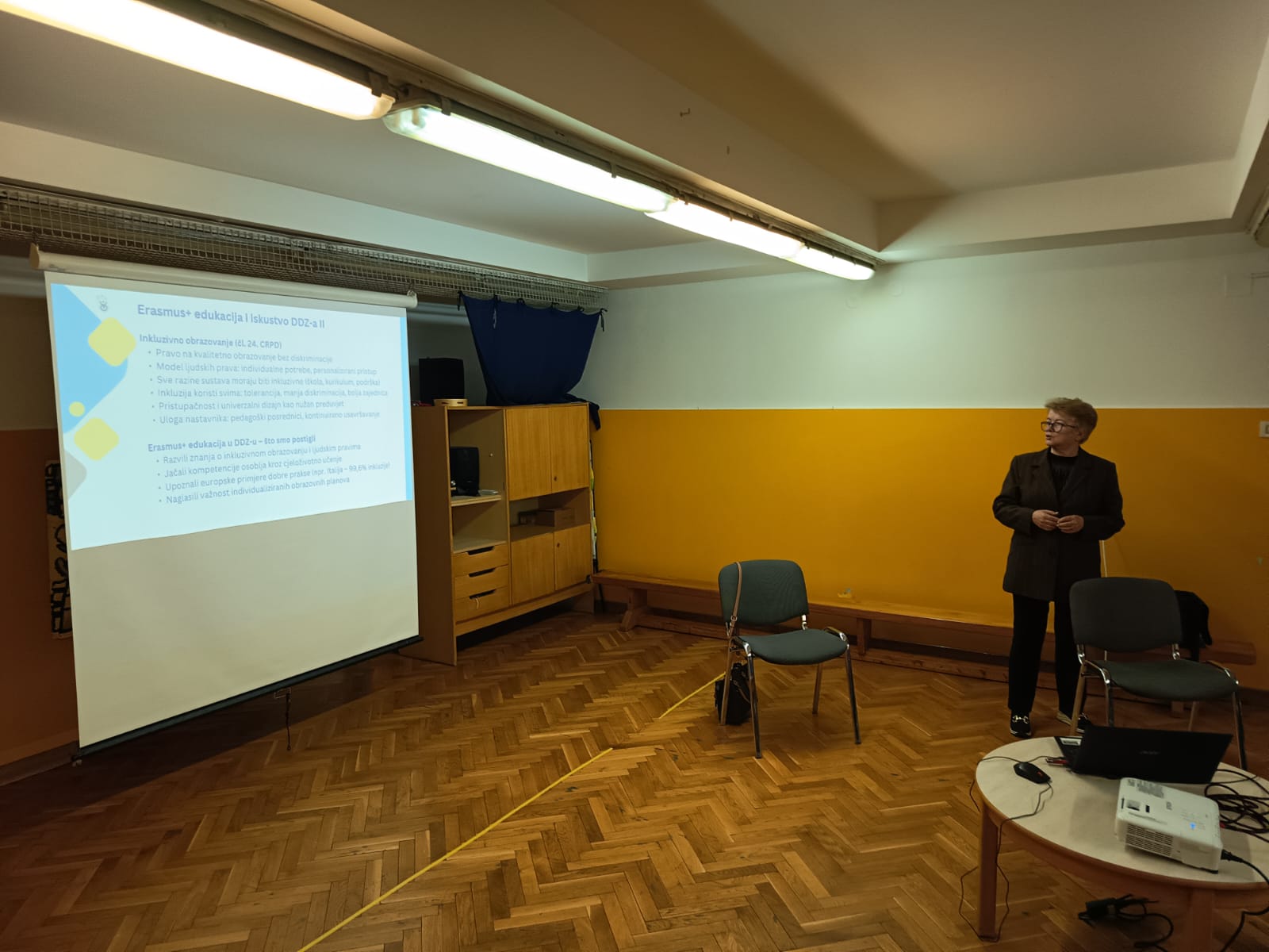 U sklopu edukacije prikazano je iskustvo Erasmus+ akreditacije u sklopu koje je DDZ proveo edukacije zaposlenika u području obrazovanja odraslih, a koja je poslužila kao primjer europske dobre prakse u razvoju inkluzivnog odgoja i obrazovanja od najranije dobi. Sudionicima su predstavljeni modeli inkluzivnih vrtića i školskih zajednica iz Italije, razvijeni u skladu s načelima Konvencije UN-a o pravima osoba s invaliditetom. Kroz ovaj dio predavanja istaknuta je važnost međunarodne suradnje i cjeloživotnog učenja stručnog osoblja, kao i praktične primjene znanja stečenih kroz Erasmus+ mobilnosti u svakodnevnom radu s djecom.
