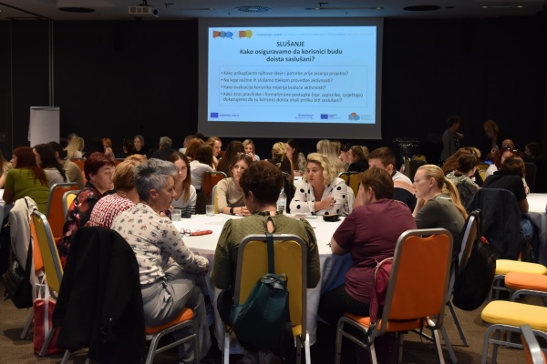 Panelistice Maja Ogrizović (Udruga Filmaktiv), Ana Skledar Matijević (Institut za razvoj obrazovanja) i Hilarija Lozančić Benić (Turističko-ugostiteljska škola Dubrovnik) predstavile su konkretne primjere dobre prakse i pristupe participaciji unutar svojih organizacija. U sklopu radionice Tour de World Café, sudionici su imali priliku samostalno analizirati različite razine participacije te osmisliti načine kako unaprijediti uključivanje korisnika u planiranje i provedbu projekata.