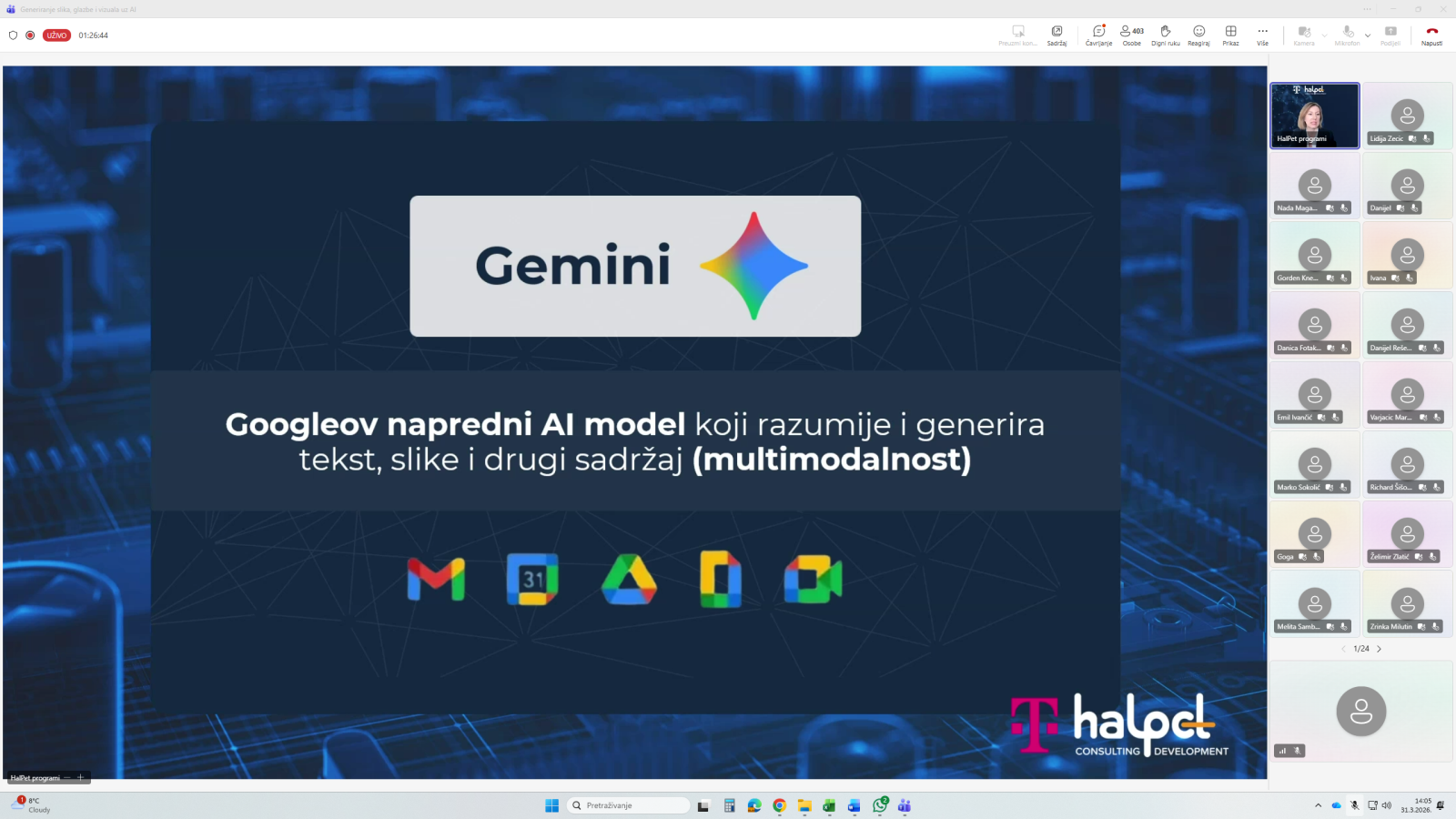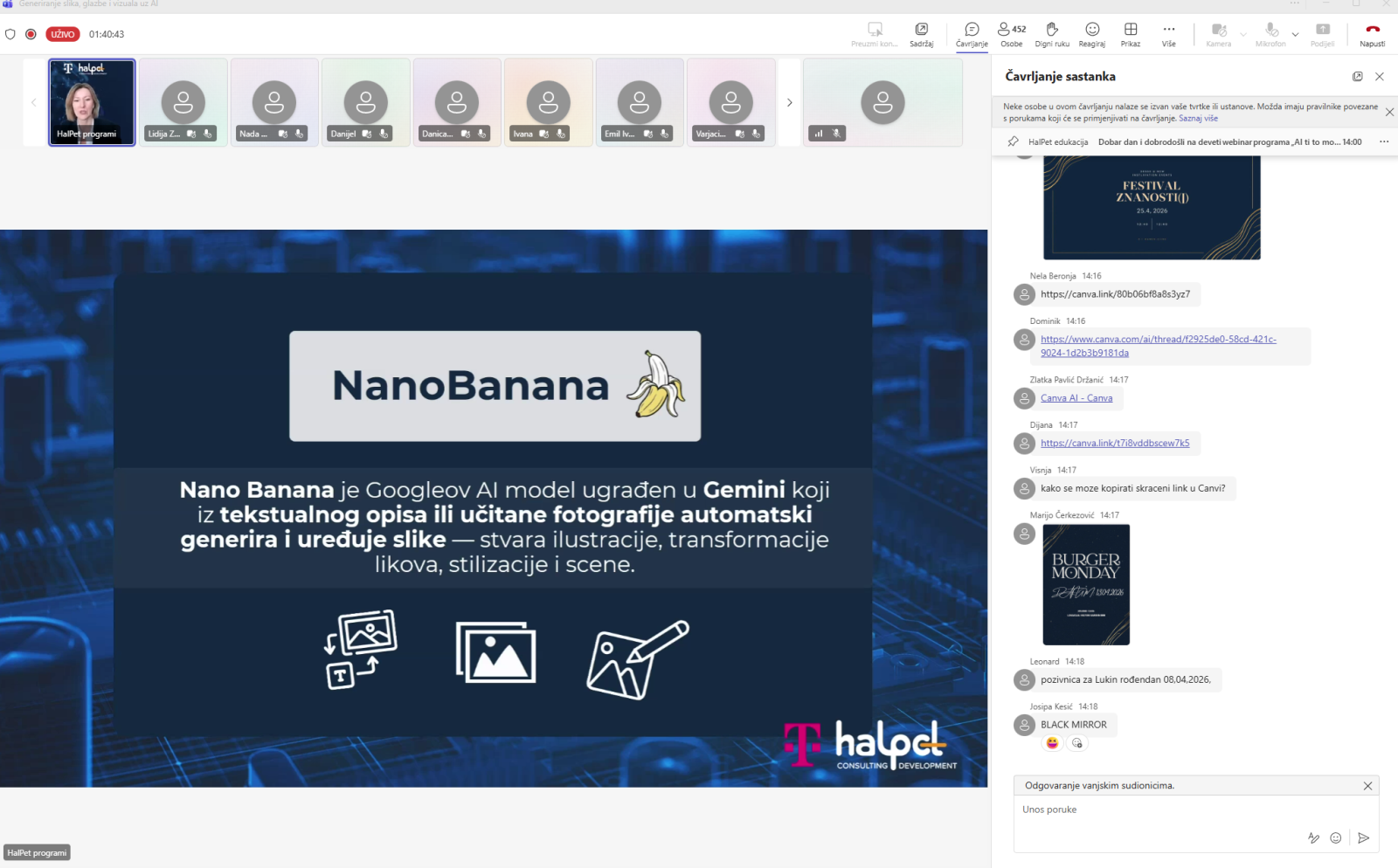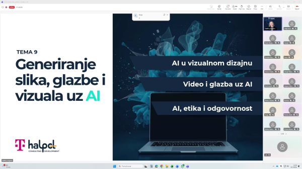 U organizaciji Hrvatskog Telekoma i HalPet-a, strateškog partnera za razvoj ljudi i organizacija, dana 31. ožujka 2026. održan je webinar na temu „Generiranje slika, glazbe i vizuala uz AI“, u sklopu „AI ti to možeš“ nacionalnog programa besplatnih edukacija o umjetnoj inteligenciji. Govorilo se o praktičnoj primjeni AI alata u poslovnom i svakodnevnom okruženju te su sudionici bili upoznati s mogućnostima korištenja alata umjetne inteligencije za izradu kreativnih vizualnih i glazbenih sadržaja. Sudjelovale su Draženka Pavlek i Helena Đurinić.