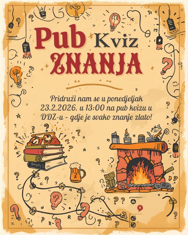 Vijesti 17.2.2026. Pub kviz u DDZ-u - Doza znanja, smijeha i dobre vibre Pročitaj više 12.2.2026. Poziv na mjesečno druženje članova DDZ, četvrtak 26. veljače u 11 sati Pročitaj više 4.2.2026. ONE BILLION RISING - MILIJARDA USTAJE - "Ustanimo za naša tijela, našu Zemlju i našu budućnost" Pročitaj više 23.1.2026. DDZ kreativna radionica - 28.1.2026., 11 sati Pročitaj više 22.1.2026. Kuhali smo u Novom Jelkovcu Pročitaj više
