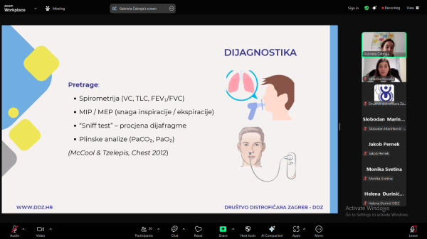 Kroz predavanje je objašnjena važnost pravovremenog prepoznavanja slabosti respiratorne muskulature kod osoba s neuromuskularnim bolestima te uloga fizioterapije u praćenju disanja, jačanju respiratorne muskulature i prevenciji komplikacija. Posebno je istaknuta važnost edukacije korisnika i njegovatelja o ranim znakovima respiratornog umora, kao i o tehnikama olakšavanja iskašljavanja i održavanja ventilacije.