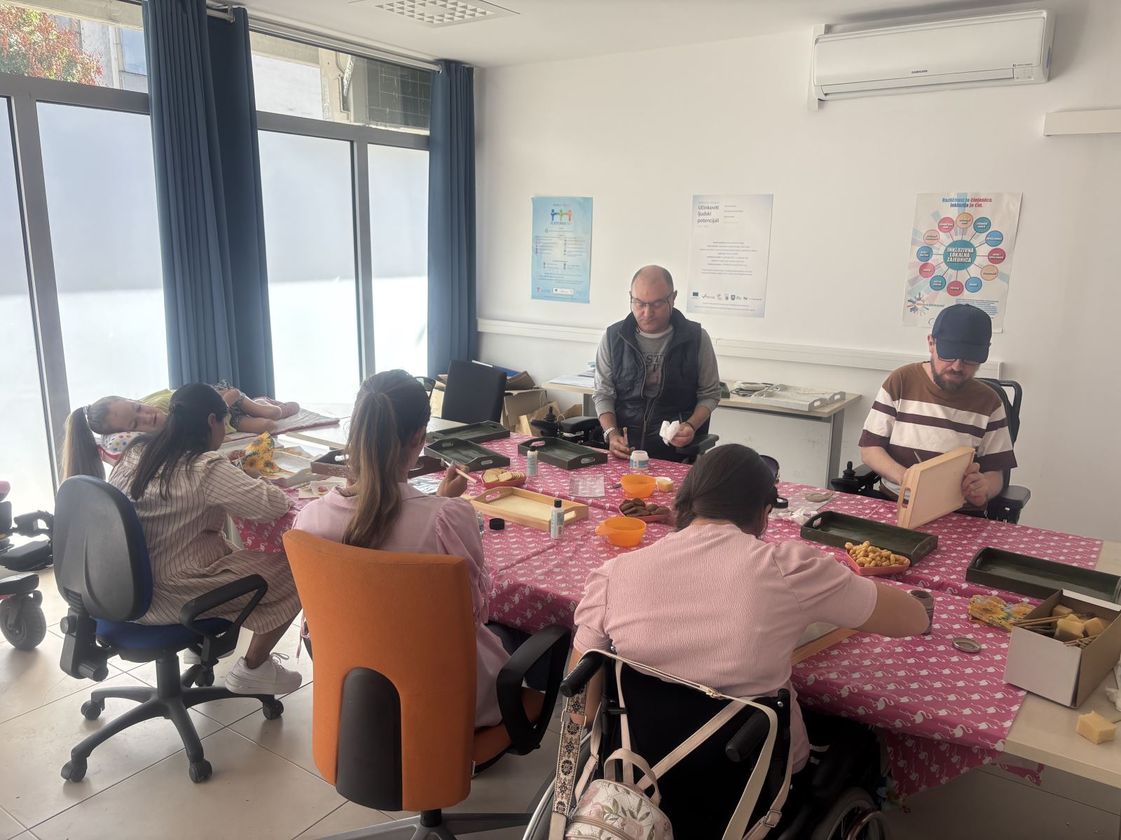 Održana je kreativna radionica dana 19. rujna 2025. za korisnike u prostorima DDZ-a u Novom Jelkovcu pod nazivom „Decoupage na drvenim tacnama“. Radionicu je vodila radna terapeutkinja Katarina Kovačić. Korisnici su se upoznali s osnovnim tehnikama decoupagea – pripremom površine, odabirom motiva, lijepljenjem salveta te završnom obradom lakom. Svaki je korisnik izradio vlastitu unikatnu drvenu tacnu, koristeći različite uzorke i dekorativne elemente prema osobnom stilu. Osim razvoja kreativnosti i finomotoričkih vještina, aktivnost je potaknula međusobnu suradnju, razmjenu ideja i osjećaj postignuća kod sudionika. Aktivnost je provedena u okviru treće godine trogodišnjeg programa „Neovisno življenje osoba s mišićnom distrofijom“, sufinanciranog od strane Grad Zagreb. Sudjelovala je fizioterapeutkinja Gabriela Čabraja i 4 korisnika.