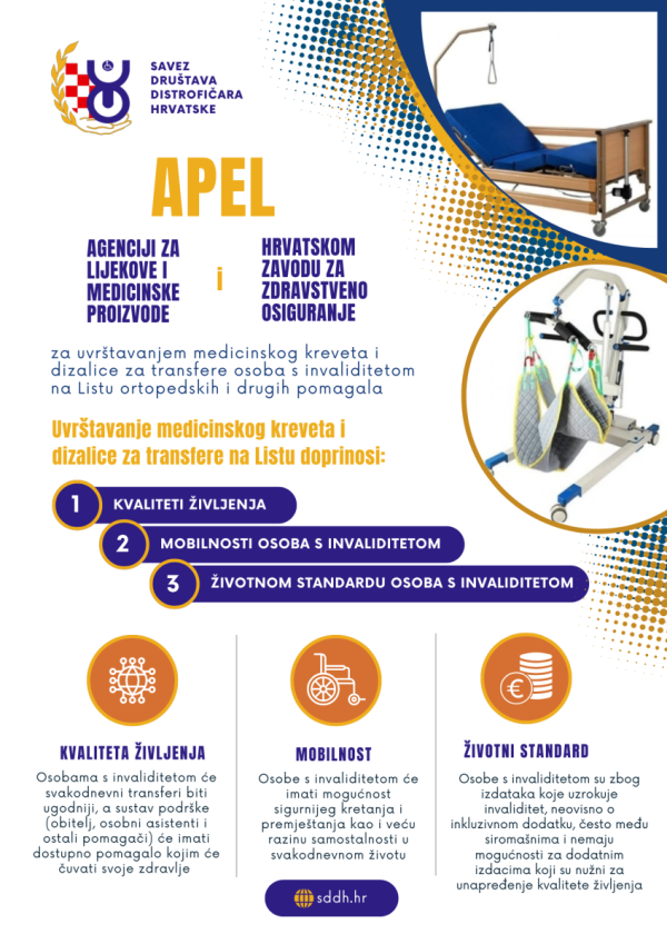 Ove, kao i prošle godine, s obzirom na brojne predstavke obitelji, osobnih asistenata i ostalih pomagača koji pružaju neposrednu podršku osobama s najtežim invaliditetom, apeliramo da se na Listu ortopedskih i drugih pomagala Hrvatskog zavoda za zdravstveno osiguranje - HZZO uvrsti medicinski krevet (koji ima mogućnost električnog podešavanja visine, uzglavlja i podnožja). Istovremeno apeliramo da se uvrsti i dizalica kojom se osoba premješta iz kreveta u invalidska kolica, iz kolica na toalet, u vozilo i drugo. Dizalica služi kako bi pomagači mogli sigurno raditi, bez opterećivanja i ugrožavanja svoje kralježnice.
