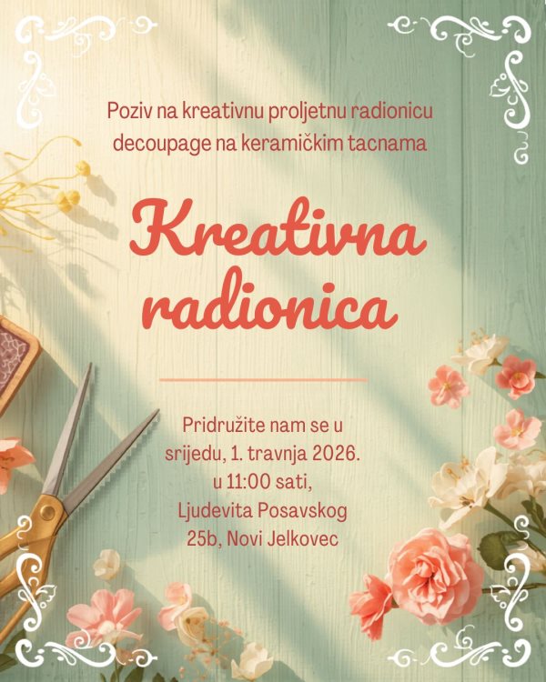 Zato vas s veseljem pozivamo na proljetnu kreativnu radionicu koja će se održati u prostorijama DDZ-a u Novom Jelkovcu, Ul. Ljudevita Posavskog 25b, u srijedu 1.4.2026. u 11:00 sati, na kojoj ćemo ukrašavati keramičke tacne decoupage tehnikom.