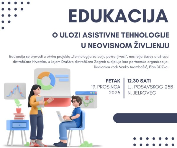 SDDH edukacija o ulozi asistivne tehnologije u neovisnom življenju Pozivamo vas na radionicu Saveza društava distrofičara Hrvatske "Edukacija o ulozi asistivne tehnologije u neovisnom življenju" u petak, 19. prosinca 2025. s početkom u 12:30 sati u prostorima Društva distrofičara Zagreb, na adresi Ljudevita Posavskog 25b, Novi Jelkovec, Sesvete. Radionica se provodi u okviru projekta „Tehnologija za bolju pokretljivost“, financiranog iz proračuna Grada Zagreba, nositelja Savez društava distrofičara Hrvatske, u kojem Društvo distrofičara Zagreb sudjeluje kao partnerska organizacija. Radionicu vodi Marko Arambašić, član DDZ-a. 📝 Prijave su obavezne putem obrasca: https://docs.google.com/forms/d/e/1FAIpQLSdUq-P_xS_syJ2C1TSRLfgwV8DZwSQ7rdy9aEqgJKEogXhsNQ/viewform?fbclid=IwY2xjawOs-kJleHRuA2FlbQIxMABicmlkETBCVmxSeGVMVlZOVUdvbERMc3J0YwZhcHBfaWQQMjIyMDM5MTc4ODIwMDg5MgABHv2ETgkCLylB0EISV1PYRKeXTC71ZH4lYdOjzgTHWT860M_2QM9jIiEt66Tg_aem_sYEPC3JZmDR1Pv3xHI4q2Q 🚐 U slučaju potrebe za prijevozom, molimo da se javite na: 📞 0800 9809 i/ili 📞 091 6033 812 Veselimo se vašem dolasku! 😊