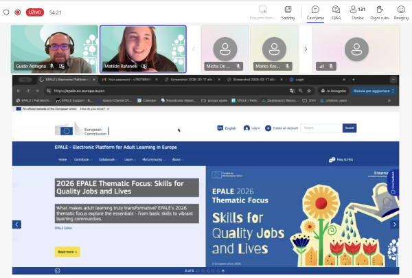Održan je EPALE Corner webinar u organizaciji platforme EPALE (Electronic Platform for Adult Learning in Europe), 19. ožujka 2026., namijenjen korisnicima i dionicima u području obrazovanja odraslih. Na webinaru je sudjelovala Ivana Kučina, Erasmus+ koordinatorica, koja je imala priliku upoznati se s najnovijim funkcionalnostima platforme te mogućnostima aktivnog sudjelovanja u EPALE zajednici. Tijekom webinara predstavljen je rad Central Support Service (CSS) tima, glavne značajke platforme, kao i praktični alati za izradu i objavu sadržaja. Poseban naglasak stavljen je na smjernice za autore (Contributor Guidelines) te načine kako učinkovito koristiti platformu za dijeljenje znanja i iskustava. Sudjelovanje na ovom webinaru doprinijet će daljnjem jačanju vidljivosti aktivnosti organizacije te kvalitetnijem korištenju EPALE platforme u okviru Erasmus+ aktivnosti.